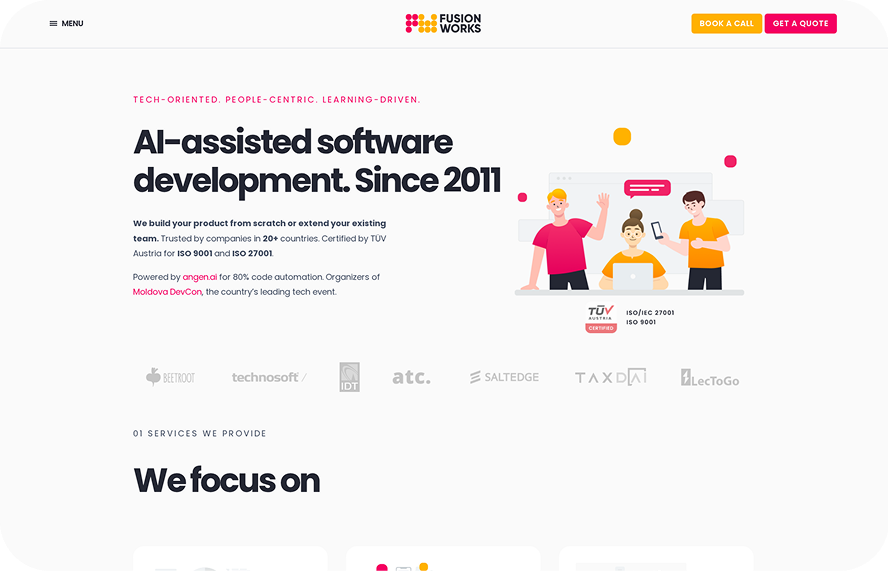 We build your product from scratch or extend your existing team. Trusted by companies in 20+ countries. Certified by TÜV Austria for ISO 9001 and ISO 27001.